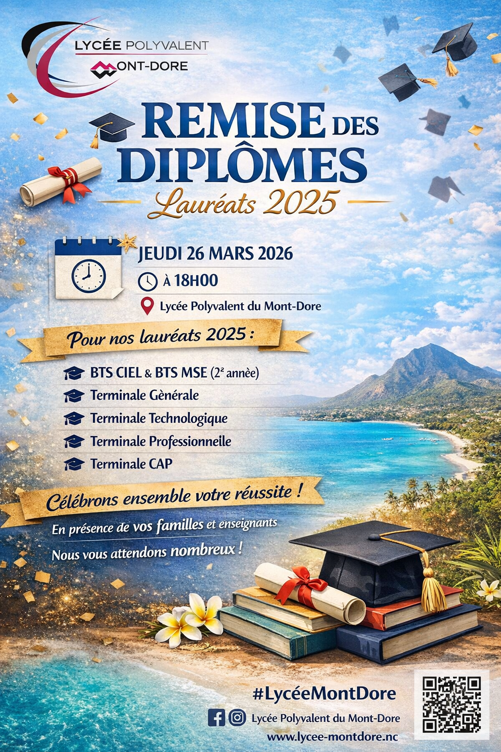 Le lycée polyvalent du Mont-Dore a le plaisir d’inviter les lauréats 2025 et leurs familles à la cérémonie de remise des diplômes.